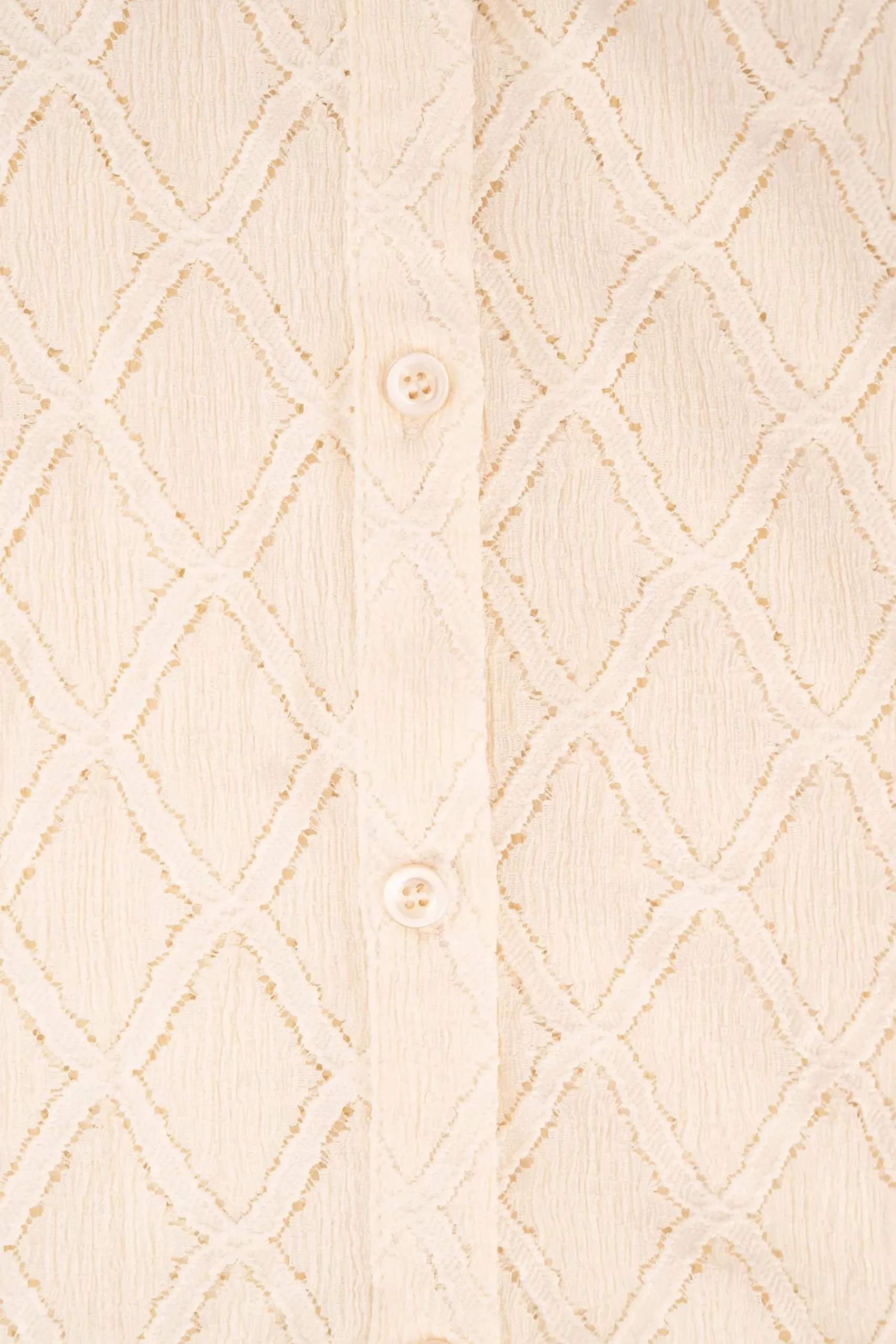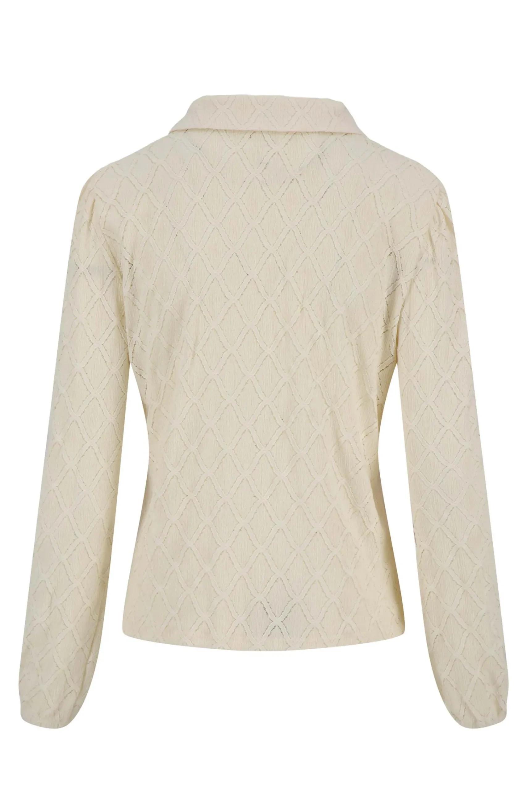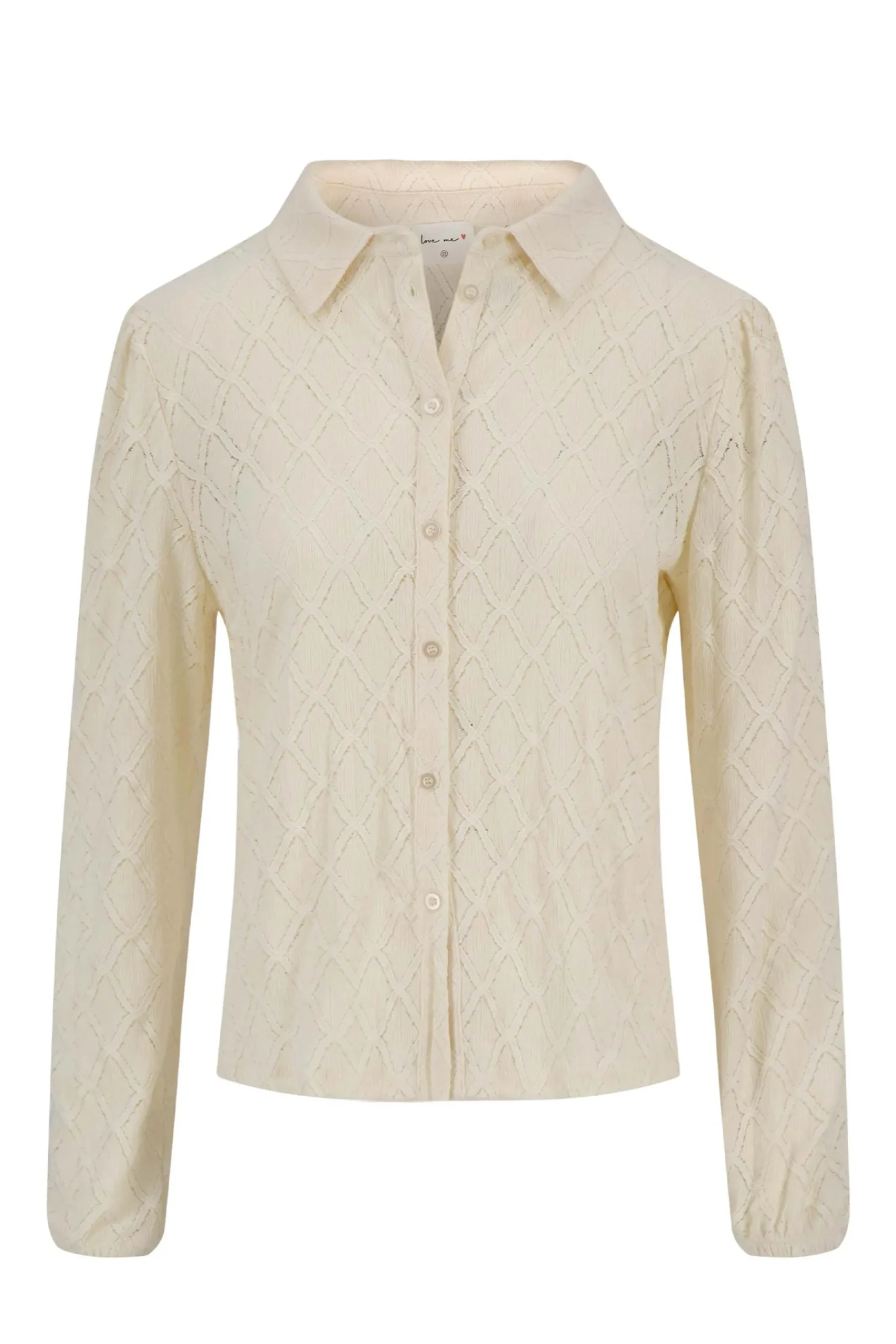 Zusss kanten blouse creme|Jaa deze wil je hebben! Deze kanten blouse van Zusss is zo leuk! Combineer ´m met een gekleurde broek of een fijne Zusss jeans. Met dit creme kleurige item is alles mogelijk! De top heeft lange mouwe, een kraagje en sluit met knoopjes aan de voorkant. De blouse is gemaakt van 98% polyester en 2% elastaan. Kijk ook eens bij de Zusss mooimakersom je outfit af te maken.|Zusss: basic, stoer, uniek en een tikkeltje eigenwijs.