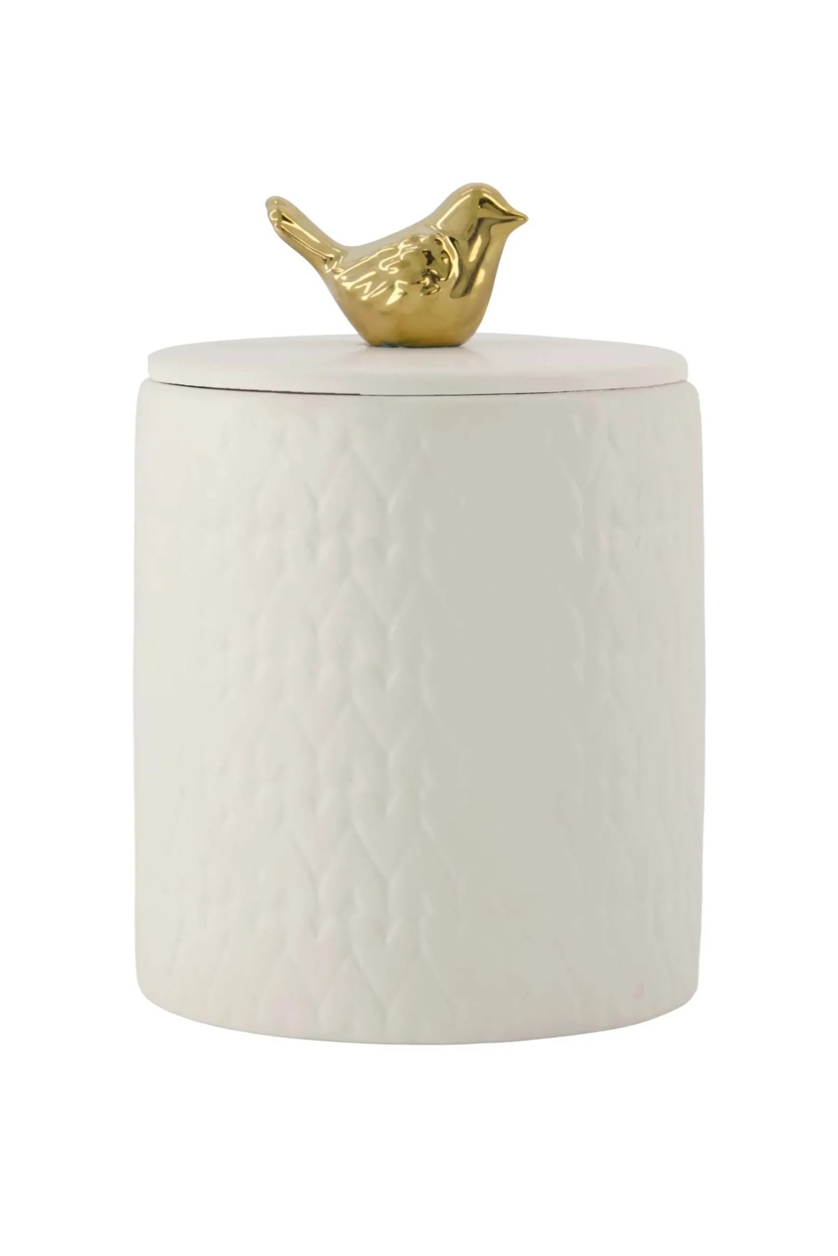 Zusss keramieken geurkaars met deksel structuur hartjes wit|Deze geurkaars van Zusss straalt liefde uit. In het witte keramiek zit namelijk een gave hartjes structuur. Deze geurkaars laat je hele huis heerlijk ruiken naar de warme, kruidige geur van crackling hearth, wat zorgt voor een knusse en gezellige sfeer! Extra leuk is het handige deksel met daarop een gouden vogeltje. De geurkaars heeft een doorsnede van 9,5cm, is 10,5cm hoog en heeft ca 50 branduren. Aan wie geef jij deze leukerd kado? |Zusss: basic, stoer, uniek en een tikkeltje eigenwijs.