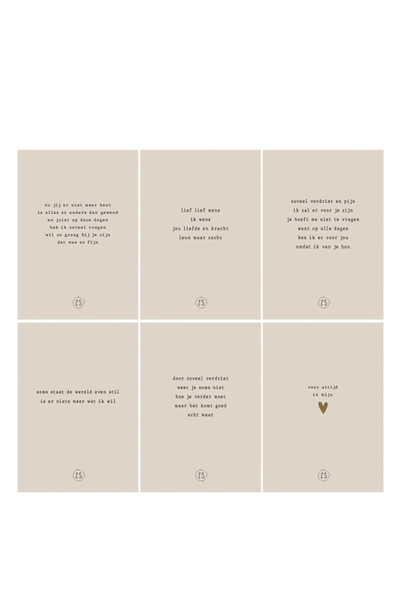 Zusss gedichtenbundel missen|Het is altijd fijn om met een ander mee te leven. In deze bundel zitten 6 verschillende gedichtjes van Zusss om te troosten. De gedichtjes zijn gedrukt op dik karton en zijn per 6 verpakt in een wikkel. De randen van de gedichtjes zijn voorzien van goudfolie en op de achterkant van elk gedichtje staat een mooi hartje in goudfolie. Combineer hem met een kaartenstandaard om iemand cadeau te doen die wel wat troost kan gebruiken. Geef ze zelf een mooi plekje of steek een ander een hart onder de riem. Erg mooi om te gebruiken als kadootje om iemand sterkte te wensen.|Zusss: basic, stoer, uniek en een tikkeltje eigenwijs.