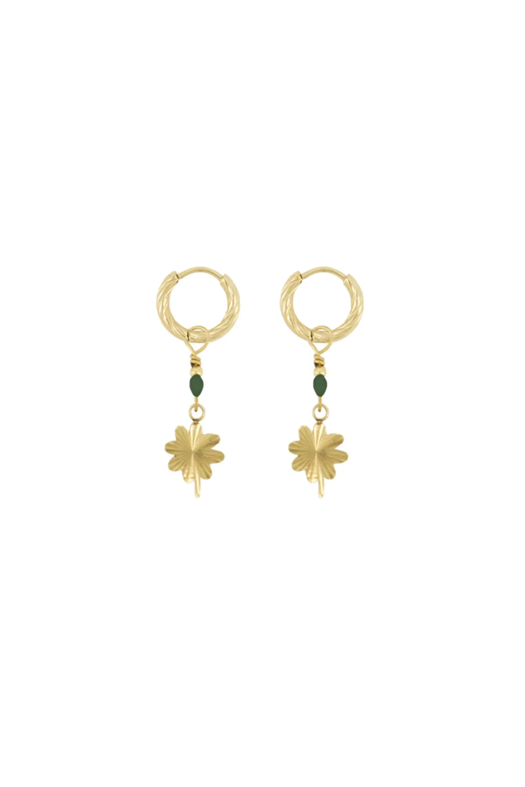 Zusss oorbel met klavertje donkergroen|Deze minimalistische oorbellen van Zusss zijn zo leuk! Aan deze gouden oorringetjes hangt een donkergroen kraaltje en een klavertje. Hoe leuk is de draai die in het oorringetje zit! Wist je dat we nog meer mooimakers met klavertjes hebben? Deze kun je perfect met elkaar combineren. Omdat de oorbellen gemaakt zijn van stainless steel verkleuren deze niet. Deze oorbellen zijn 2cm lang en 0,8cm breed. Ook leuk om kado te geven!|Zusss: basic, stoer, uniek en een tikkeltje eigenwijs.