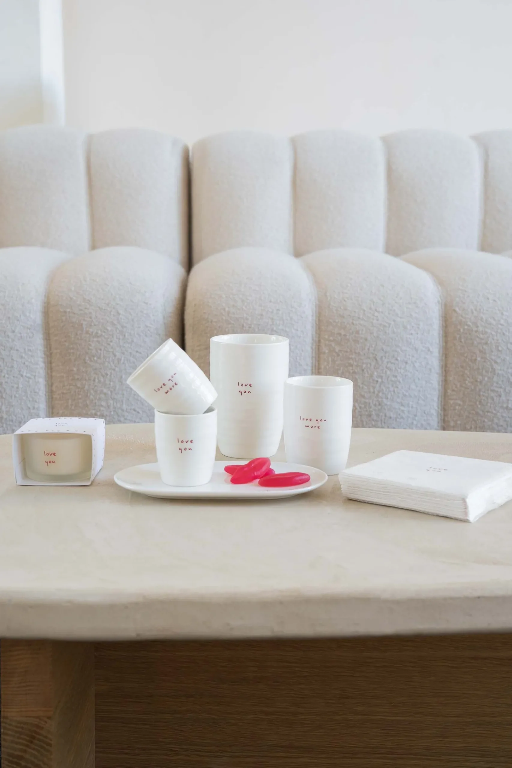 Zusss espressokopje love you more wit/rood|Dit espressokopje van Zusss is o-zo leuk! Op dit witte kopje staat in rode letters ‘love you more’. Ook erg leuk om cadeau te doen! Het espressokopje is gemaakt van aardewerk, heeft een doorsnede van 6cm en is 7cm hoog. Leuk om dit kopje te combineren met andere aardewerken items van Zusss. Je bekijkt ze in de categorie servies. |Zusss: basic, stoer, uniek en een tikkeltje eigenwijs.
