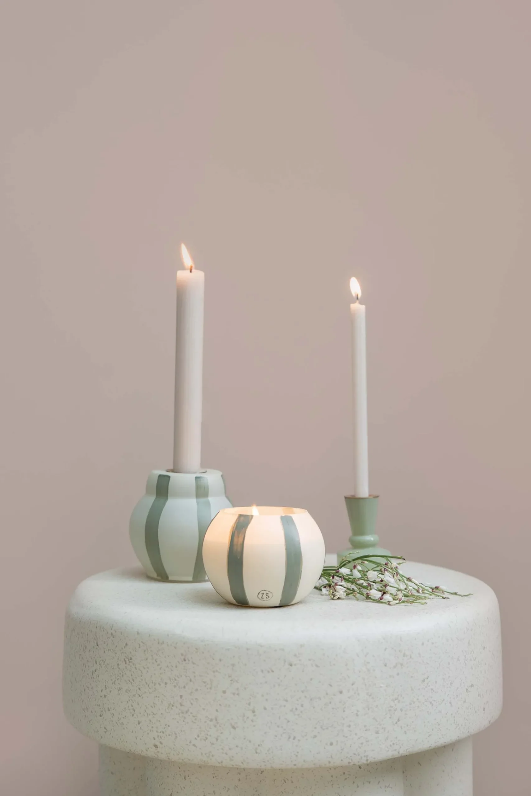 New glazen geurkaars met strepen zand saliegroen Geurkaarsen