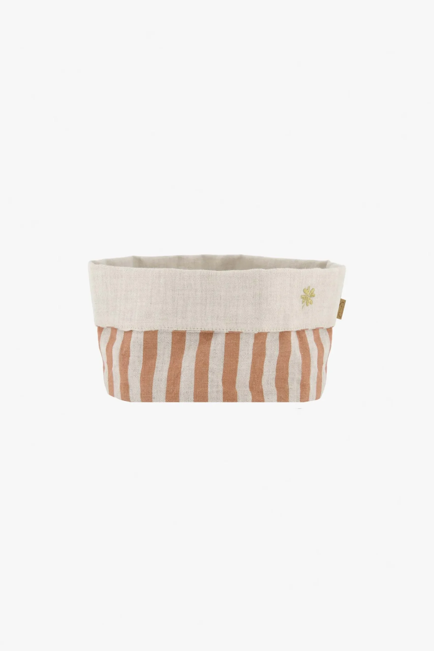 Zusss linnen mandje strepen M terra roze|Dit linnen mandje van Zusss ziet er gezellig uit! Het mandje heeft op de onderste helft terra roze streepjes en op het bovenste deel staat een gouden klavertje geborduurd. Dit mandje zet je bijvoorbeeld op de ontbijttafel met verse croissantjes. Daar wordt je toch blij van! Het mandje heeft een formaat van 20x12cm en is gemaakt van katoen. Kijk ook eens tussen het Zusss servies , we hebben vanalles.|Zusss: basic, stoer, uniek en een tikkeltje eigenwijs.