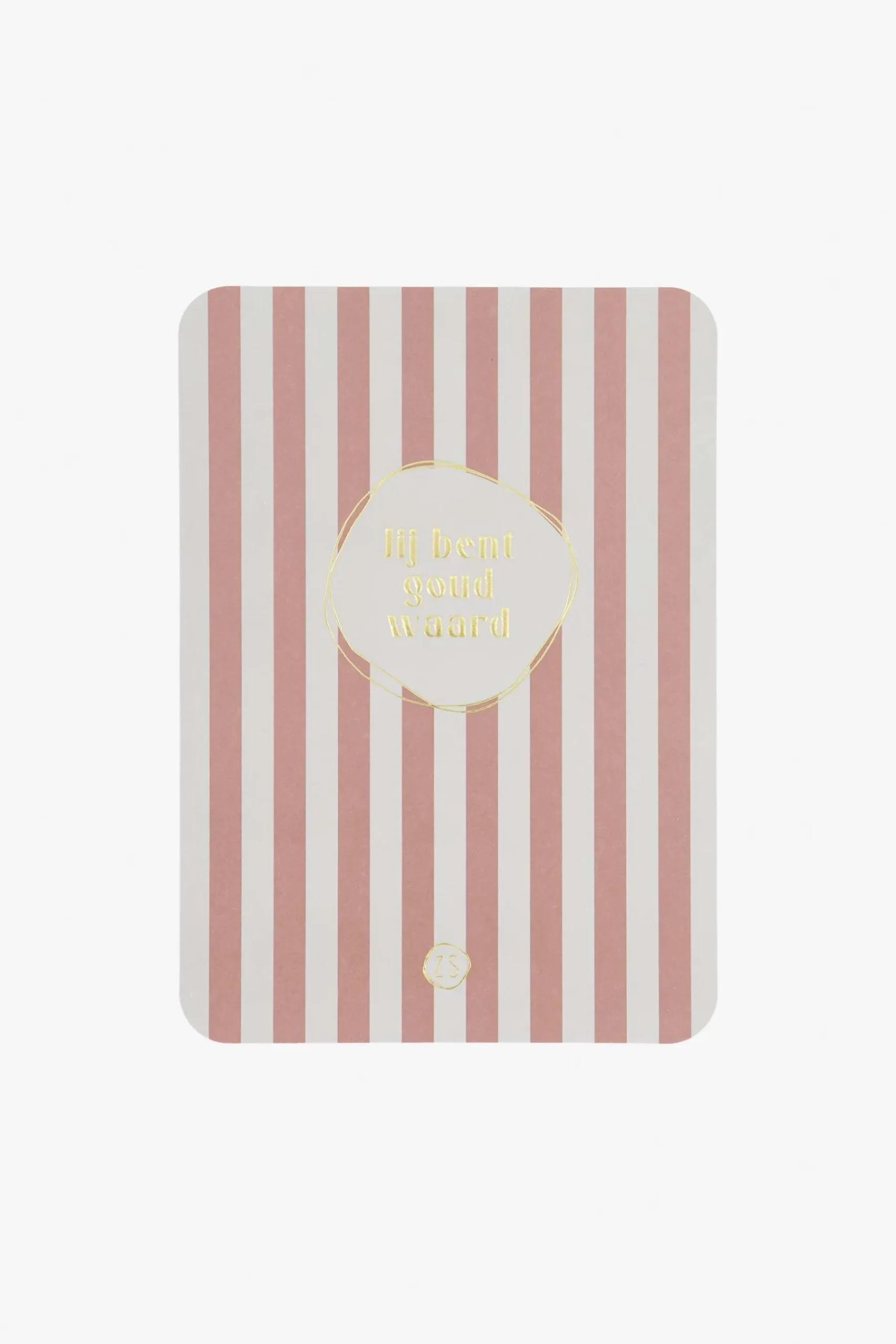 Zusss kaart ronde hoeken jij bent goud waard terra roze|Met een lief kaartje tover je al gauw een glimlach op iemands gezicht! Deze ansichtkaart is voorzien van terra roze strepen met daarop de tekst: jij bent goud waard. Om het plaatje helemaal compleet te maken combineer je deze kaart met een leuk Zusss kadootje! Tip: neem een kijkje bij de Zusss spullen voor in huis!|Zusss: basic, stoer, uniek en een tikkeltje eigenwijs.
