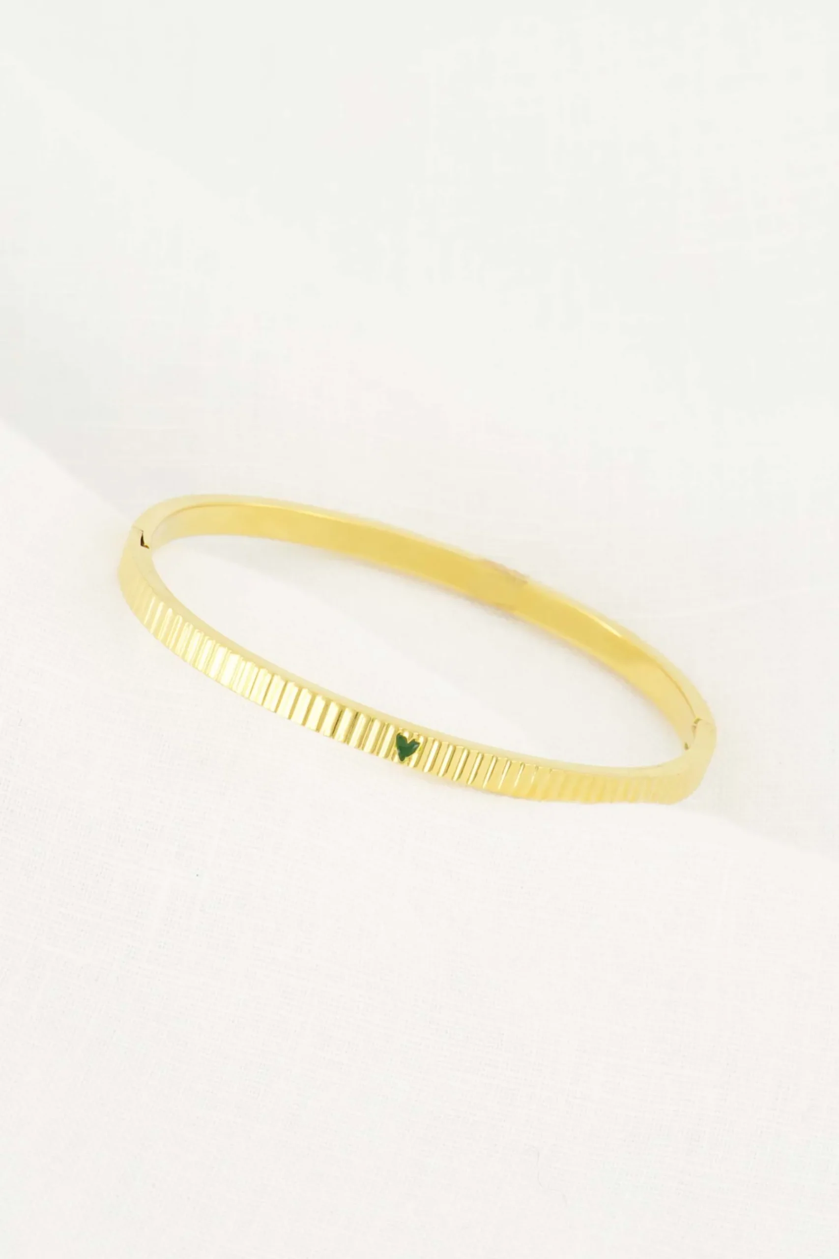 Zusss bangle armband met hartje donkergroen|Deze bangle armband van Zusss is een echte eye-catcher! In de armband staan subtiele streepjes. Hoe leuk is het subtiele donkergroene hartje dat in de armband staat. Deze mooimaker combineer je werkelijk met iedere outfit. De armband heeft een diameter van 6,3cm en is gemaakt van steenless steel, hierdoor verkleurt deze niet. Neem ook een kijkje bij de andere mooimakers van Zusss!|Zusss: basic, stoer, uniek en een tikkeltje eigenwijs.