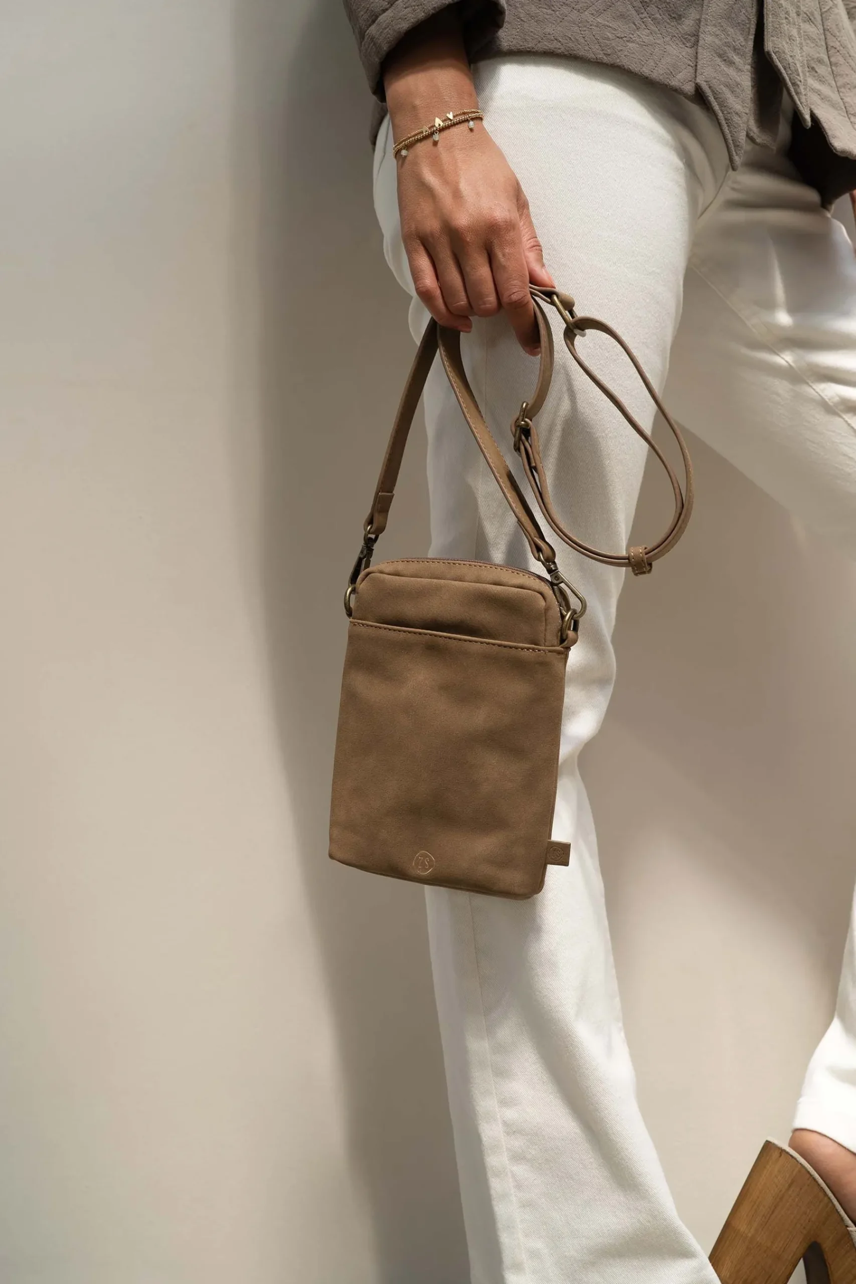 Bruin telefoontasje van Zusss|Met dit fijne telefoontasje heb je je telefoon altijd bij de hand. Door het vakje aan de voorkant kun je ook andere belangrijke voorwerpen zoals je autosleutel of lippenstift opbergen. Dit tasje is bruin van kleur en gemaakt van PU leer. Op de voorkant staat het Zusss logo in een gouden kleur. Ook op het bruine labeltje aan de rechter zijkant staat het Zusss logo afgebeeld. Welke sleutelhanger match jij met je tas?|Zusss: basic, stoer, uniek en een tikkeltje eigenwijs.