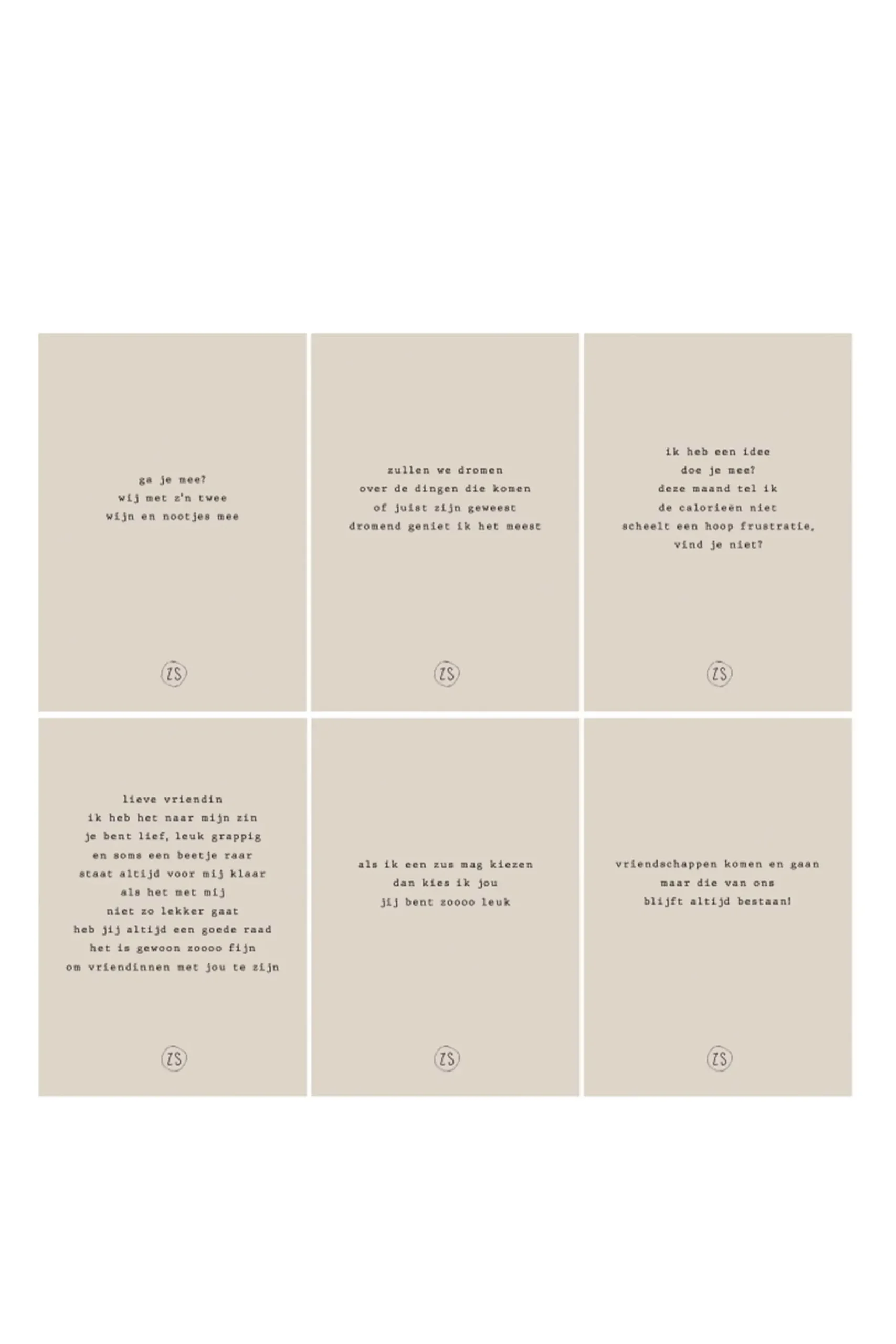 Zusss gedichtenbundel vriendschap|Het is altijd fijn om vriendschappen te vieren! In deze bundel zitten 6 verschillende vriendschaps gedichtjes van Zusss om vriendschap mee te vieren. De gedichtjes zijn gedrukt op dik karton en zijn per 6 verpakt in een blauwe wikkel. De randen van de gedichtjes zijn voorzien van goudfolie en op de achterkant van elk gedichtje staat een mooi harjte in goudfolie. Combineer hem met een kaartenstandaard om iemand cadeau te doen die je dierbaar is. Geef ze zelf een mooi plekje of geef ze aan een vriend of vriendin. Ook erg leuk om ze te gebruiken als kadootje voor je beste vriendin!|Zusss: basic, stoer, uniek en een tikkeltje eigenwijs.