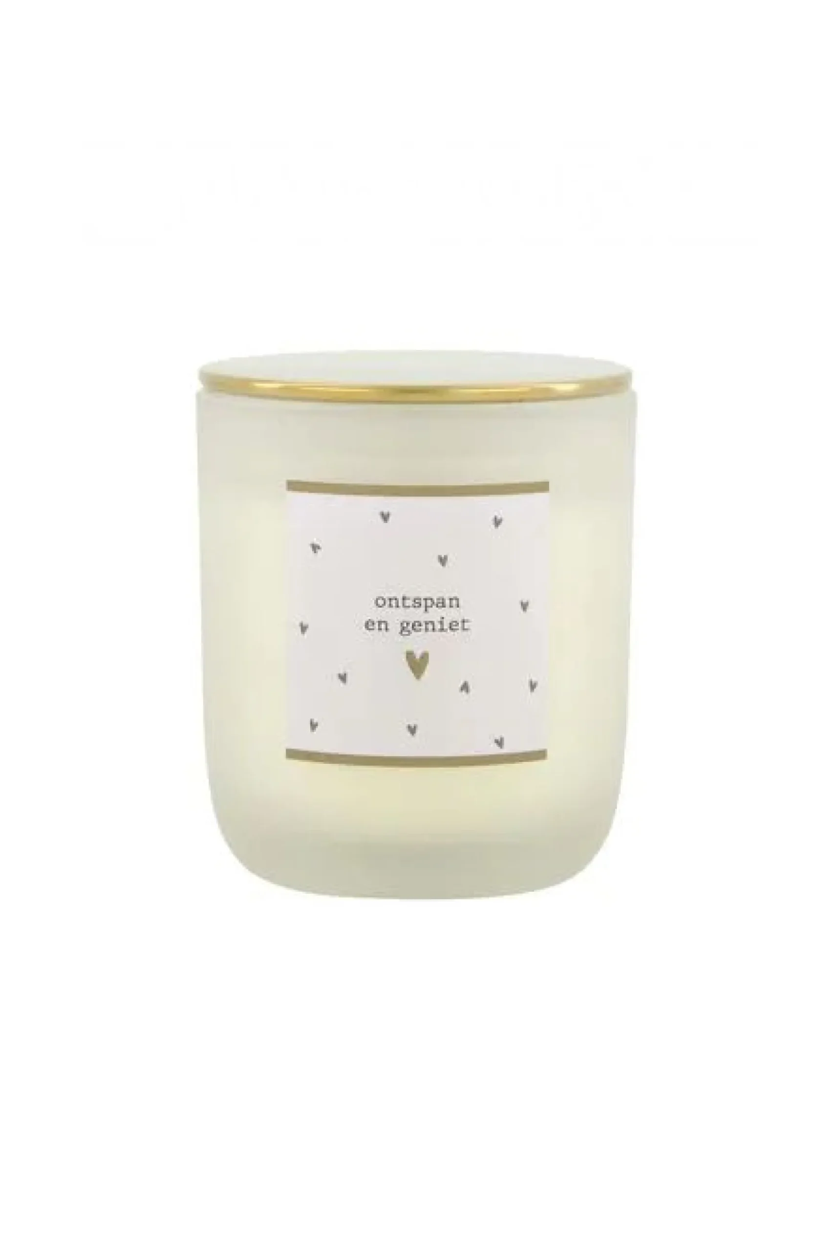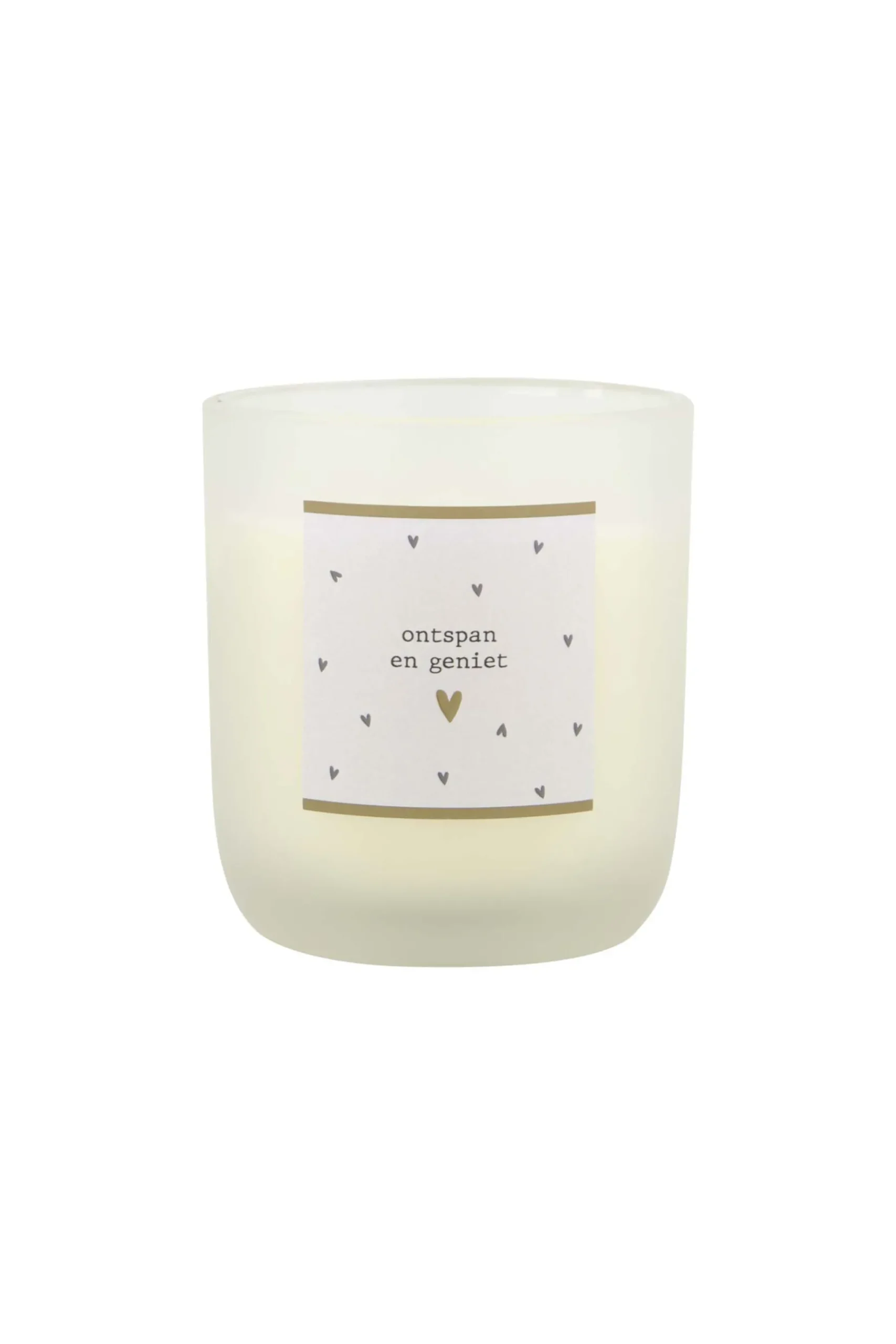 Zusss geurkaars in glas ontspan en geniet wit|Hoe leuk is deze geurkaars van Zusss! Op het glas zit een etiket met daaro…