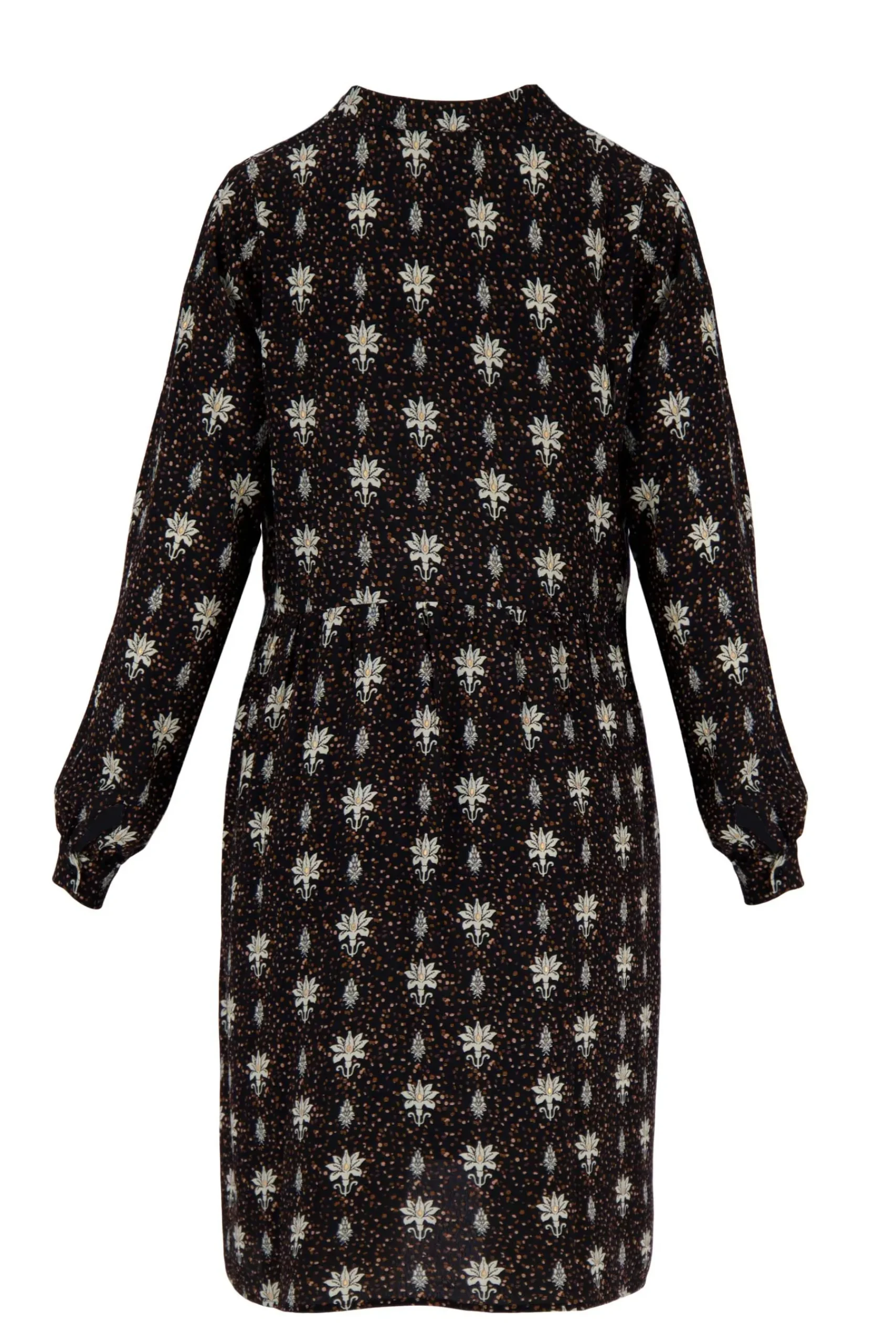 Zwarte limited jurk met bloemenprint van Zusss|Oeh la la! Lekker zwaaien en zwieren in deze bloemetjesjurk. Met z’n lange mouwen, een kleine v-hals en bruine details is dit gave kledingstuk onmisbaar in je garderobe. Draag ‘m in de winter met een dikke panty en in de zomer alleen met een kort Zusss laarsje. De viscosestof is licht, voelt fijn op de huid en is comfy om te dragen. Was ‘t op een fijn wasprogramma op 30 graden en laat op een hanger drogen, want viscose is kreukelgevoelig. |Zusss: basic, stoer, uniek en een tikkeltje eigenwijs.