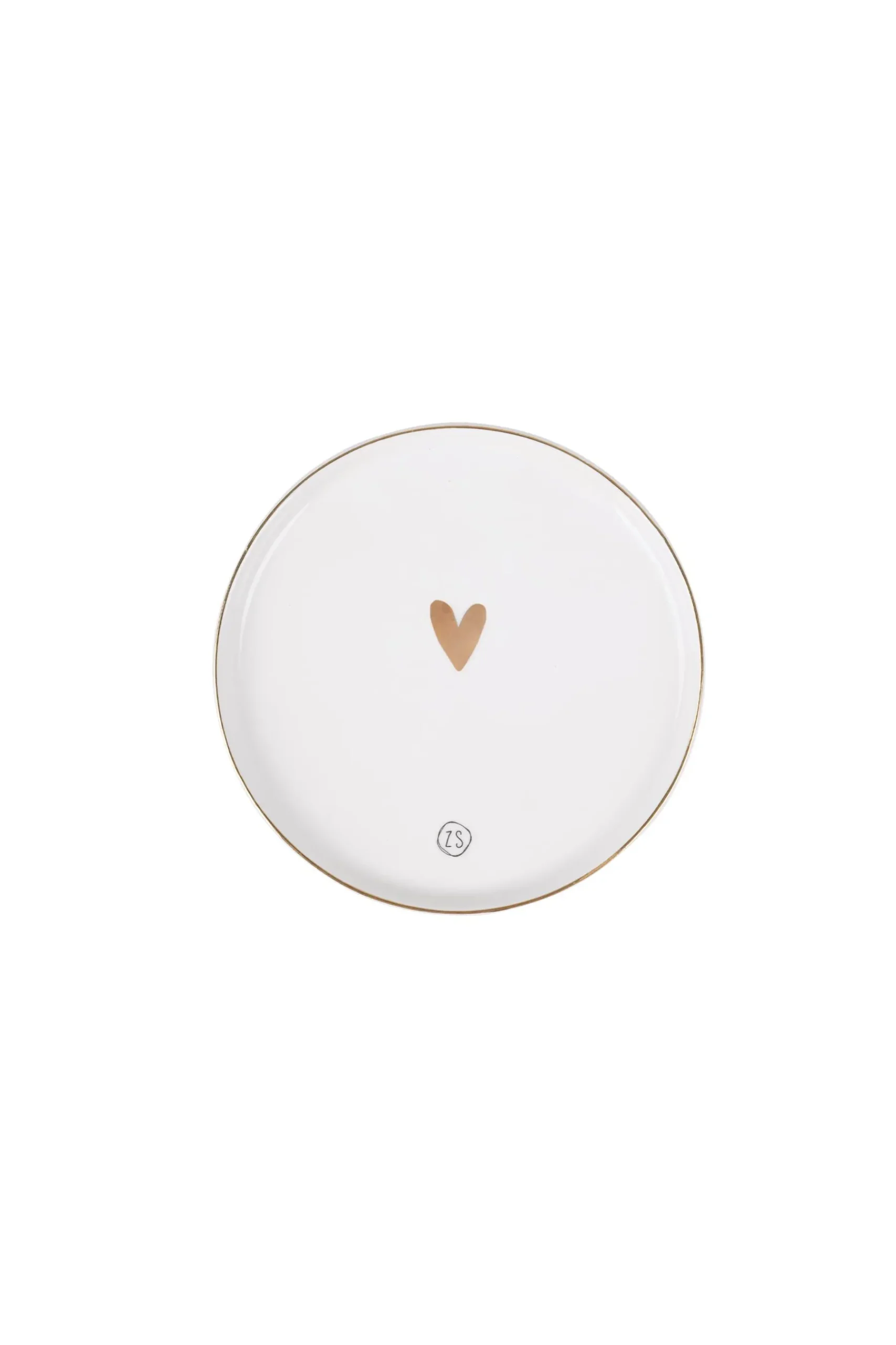Zusss gebaksbordje met goud hartje en randje|Wat zou jij serveren op dit gezellige gebaksbordje? Iets lekkers op dit bordje waar een mooi gouden hartje op staat, is een gezellige combinatie! Naast het gouden hartje heeft dit gebaksbordje ook een gouden randje. Kenmerkend van goud geglazuurd servies is dat dit niet in de vaatwasser kan, vandaar dat je dit bordje ook met de hand af moet wassen. Het bord is gemaakt van aardewerk en is 15cm breed. Op de voorkant van het bord vind je ook een subtiel Zusss logo. Leuk om deze borden te combineren met andere aardewerk items met gouden hartjes. Je bekijkt ze in de categorie servies.|Zusss: basic, stoer, uniek en een tikkeltje eigenwijs.