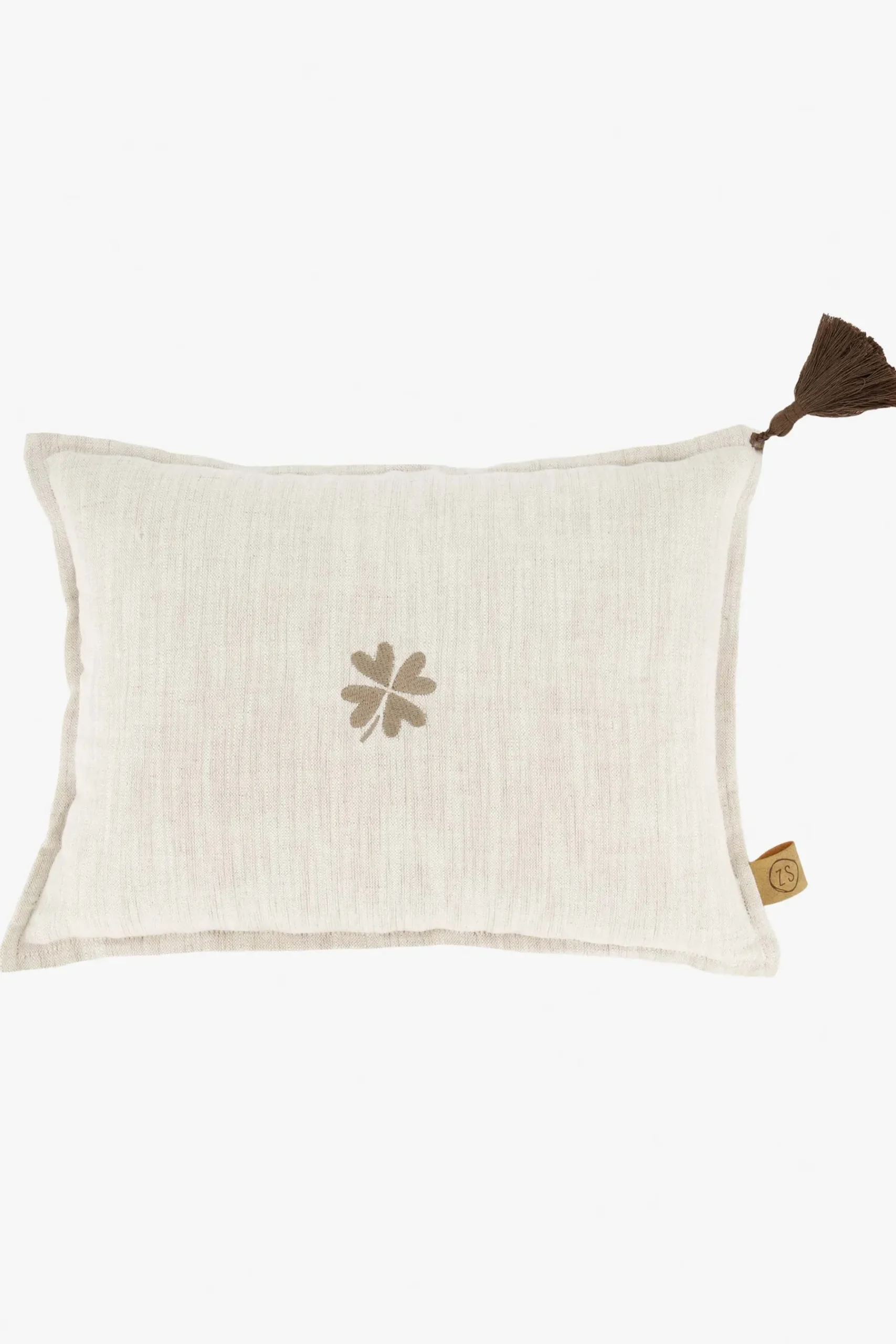Zusss kussen klavertje en strepen 35x25cm peper en zout/brique|Dit mooie kussen van Zusss maakt jouw bank direct gezellig! Op de voorkant van dit peper en zout kleurige kussen staat een klavertje geborduurd. Op de achterkant van het kussen staan strepen in de kleur brique. Een leuk detail is het kwastje rechts in de bovenste hoek. Het kussen is gemaakt van 50% katoen en 50% linnen. Het Zusss logo vind je terug op het PU label aan de zijkant. Het formaat van het kussen is 35×25 centimeter. Neem ook een kijkje bij de Zusss woonaccessoires ! Is jouw woonkamer al voorjaarsproof?|Zusss: basic, stoer, uniek en een tikkeltje eigenwijs.