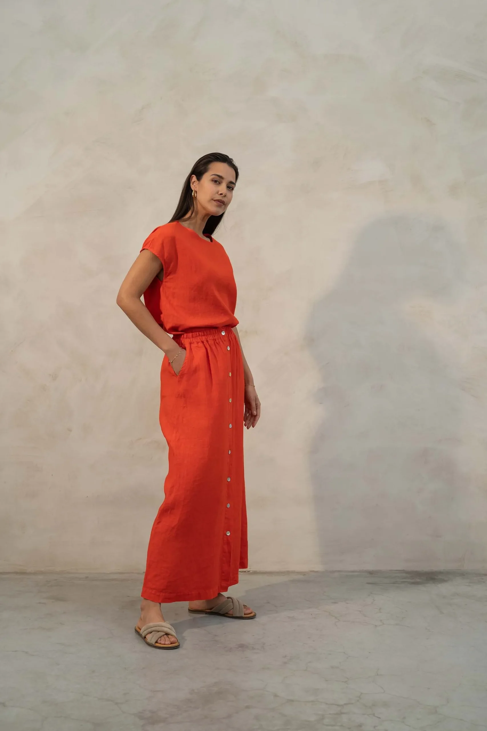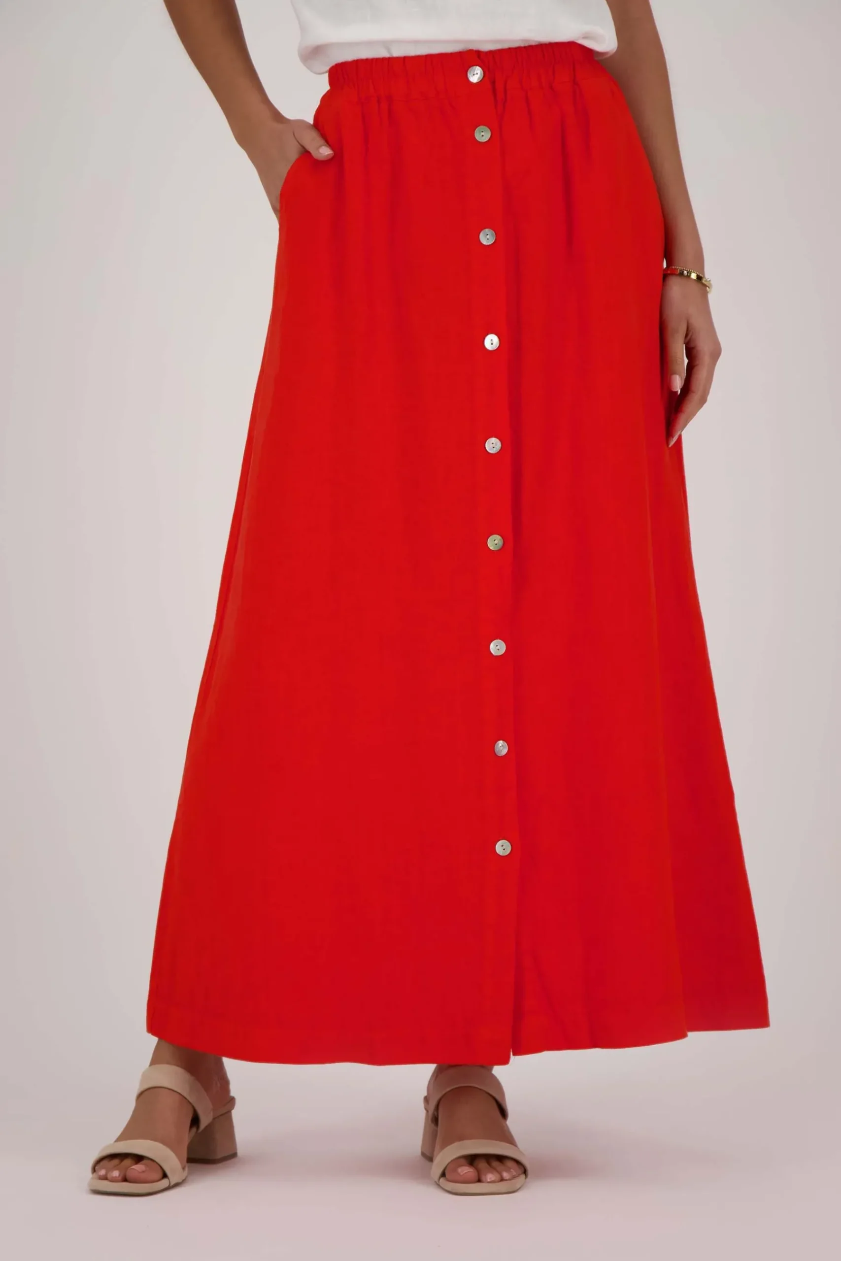 Linnen doorknooprok koraalrood|In deze linnen rok van Zusss straal jij deze zomer! Dit item is koraalrood van kleur en h…