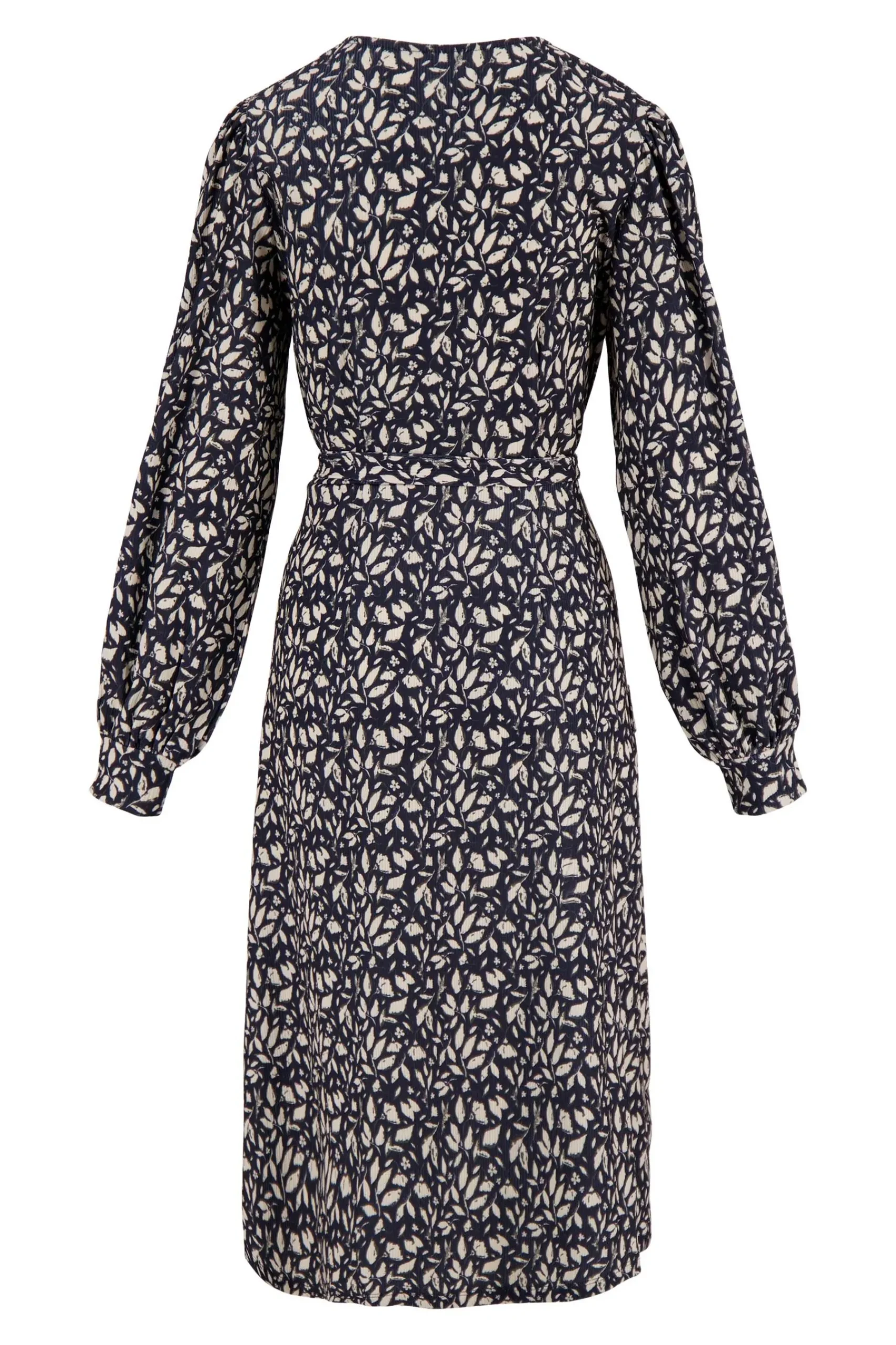 Zusss wikkeljurk met blaadjesprint donkerblauw|Prachtige wikkeljurk van Zusss met all-over print. Deze donkerblauwe jurk…