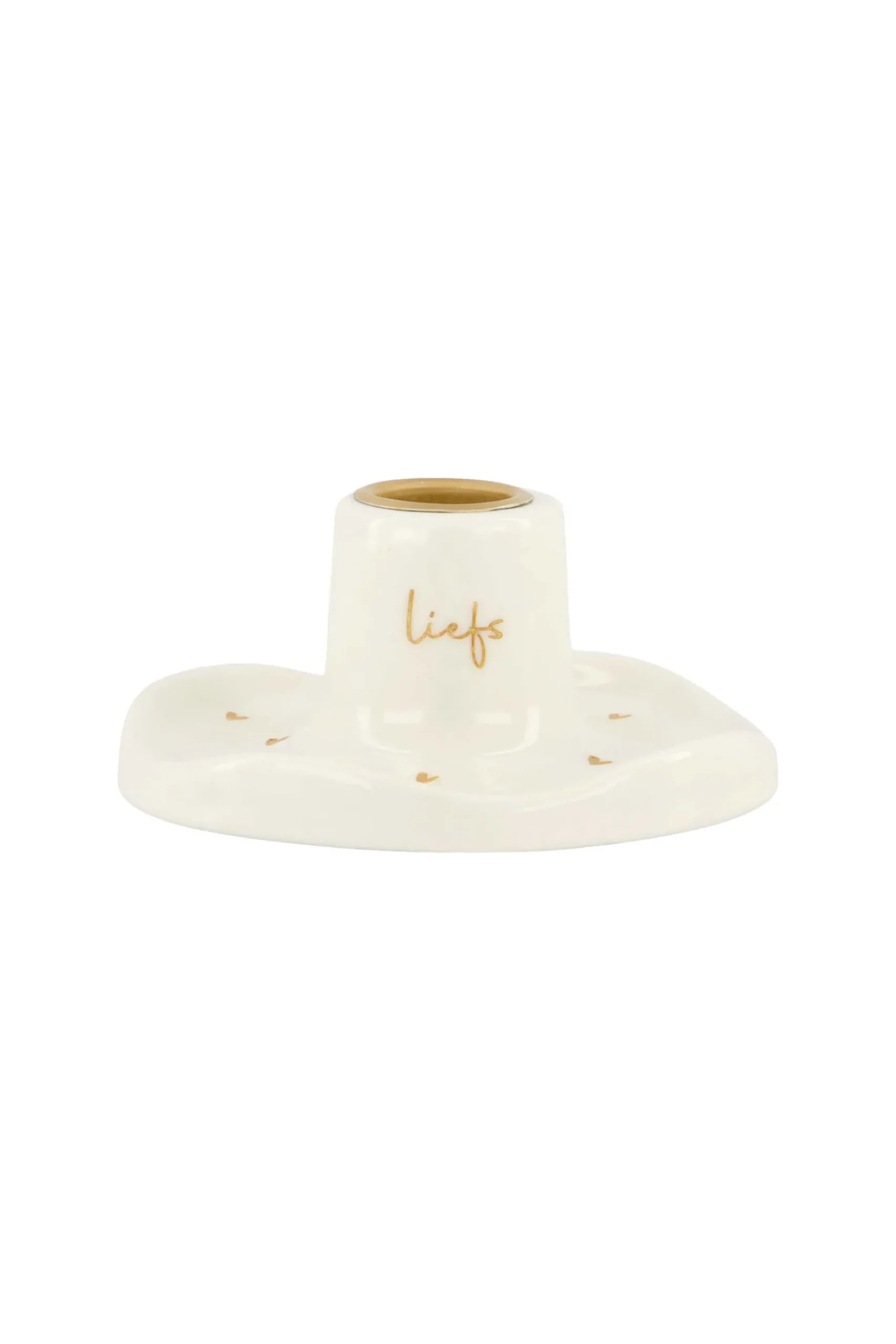 Zusss keramieken kandelaar hartjes liefs goud|In deze kandelaar van Zusss kun je de leukste kaarsen branden. Deze kandelaar is gemaakt van keramiek en heeft een ronde vorm. Deze witte kleur is gemakkelijk te combineren met andere woonaccessoires. Op deze kandelaar staan gouden hartjes en ‘liefs’. In deze kandelaar passen de rustieke Zusss kaarsen van 12cm en 20cm, en de geribbelde Zusss kaarsen van 20cm. De kandelaar is 5×10,5cm groot. Ook erg leuk te combineren met andere Zusss kaarsenhouders of een leuke vaas!|Zusss: basic, stoer, uniek en een tikkeltje eigenwijs.