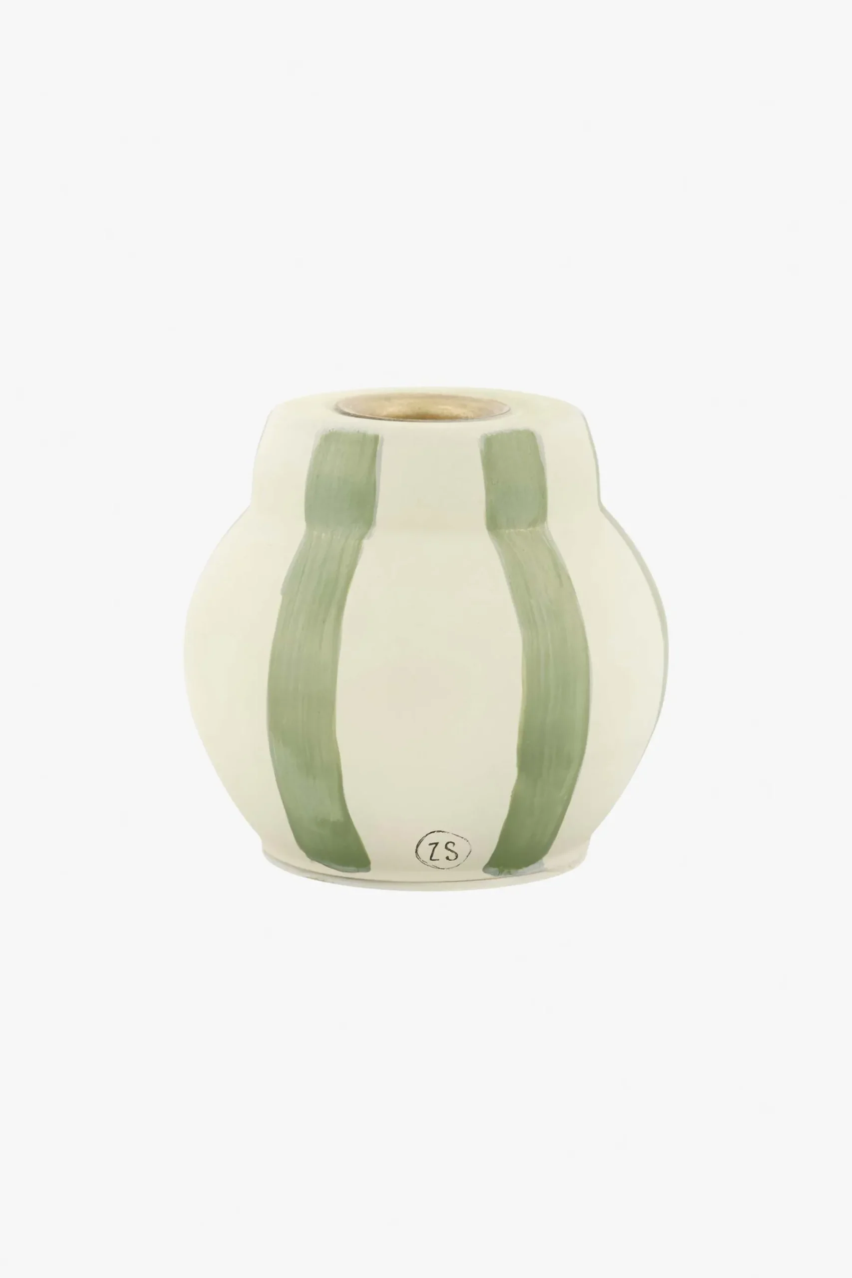 Zusss glazen kandelaar met strepen zand/saliegroen|Jaaa, dit pareltje wil je hebben! Deze glazen kandelaar van Zusss is lekker vrolijk. Zet hierin gezellig een kaarsje aan tijdens het diner of gewoon als je met je theetje op de bank zit. Deze zand en saliegroen gestreepte kandelaar brengt je helemaal in de voorjaarssferen. In deze kandelaar passen de rustieke Zusss kaarsen van 12cm en 20cm, en de geribbelde Zusss kaarsen van 20cm. De kandelaar heeft een doorsnede van 9 centimeter en is 8,5 centimeter hoog. Ook erg leuk als kadootje! |Zusss: basic, stoer, uniek en een tikkeltje eigenwijs.