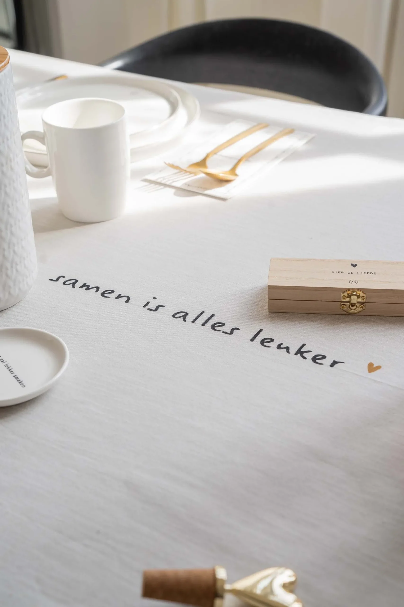 Zusss tafelkleed samen is alles leuker 250x150cm peper en zout|Dit tafelkleed van Zusss maakt de gedekte tafel helemaal af! Dit tafelkleed is peper en zout kleurig met daarop de tekst: samen is alles leuker. Het tafelkleed is 250cm lang en 150cm breed. Tip: neem eens een kijkje bij het Zusss servies! |Zusss: basic, stoer, uniek en een tikkeltje eigenwijs.