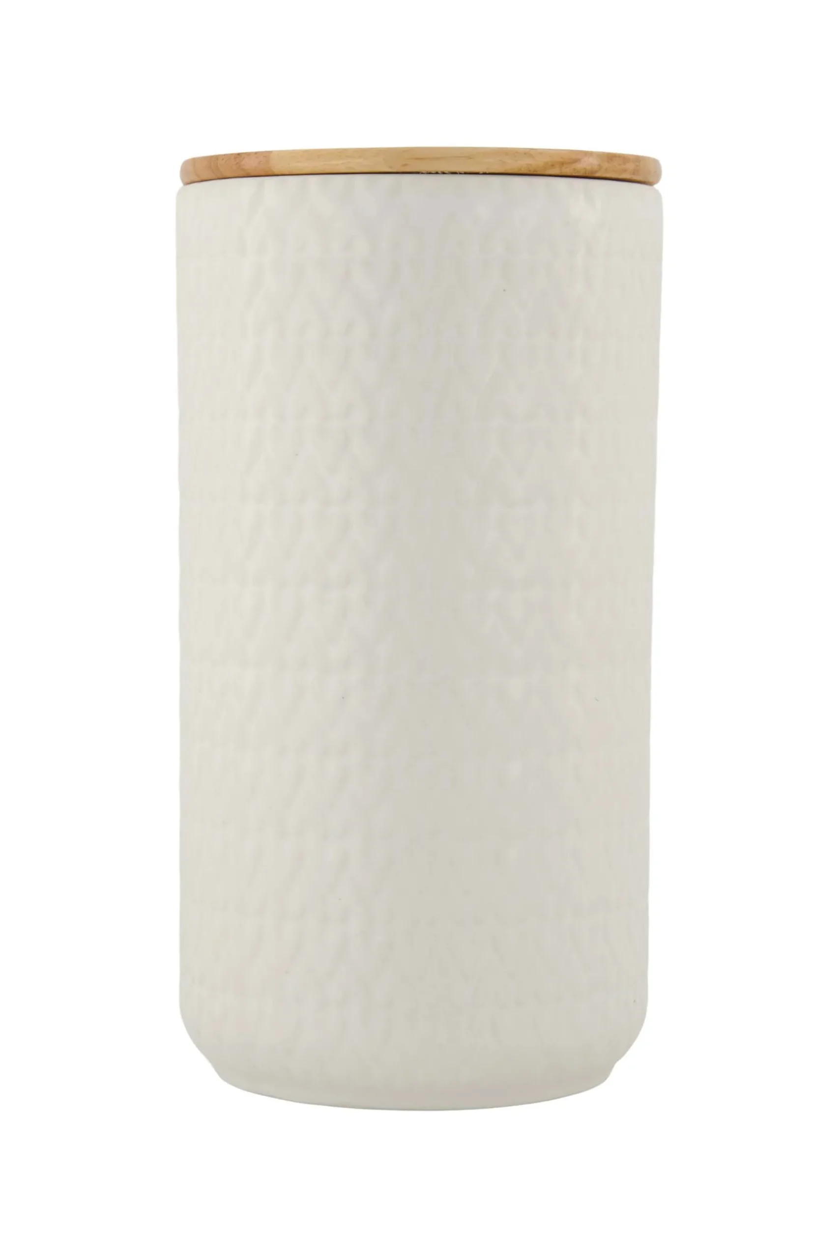 Zusss keramieken bewaarpot met houten deksel hartjes 20cm wit|Deze bewaarpot van Zusss is niet alleen handig maar ziet er ook nog eens mooi uit! Deze witte pot is gemaakt van keramiek met een hartjes structuur. Je kunt de bewaarpot afsluiten met een houten deksel. Deze bewaarpot is 20cm hoog. Tip: neem eens een kijkje bij het Zusss servies! |Zusss: basic, stoer, uniek en een tikkeltje eigenwijs.