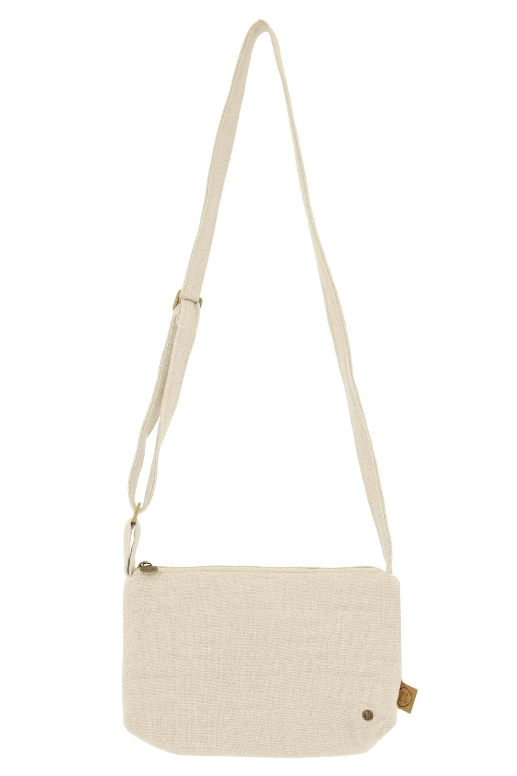 Zusss schoudertasje met stiksels|Deze Zusss schoudertas is geschikt voor verschillende gelegenheden. De tas is peper en zout kleurig en is 23x13x5 centimeter groot. De structuur in de stof maakt dit schoudertasje uniek. Het Zusss logo vind je terug op de voorkant en op het leren labeltje aan de zijkant. Het tasje sluit met een rits. Aan de rits vind je een muntje met daarop het Zusss logo afgebeeld. Met welke Zusss outfit zou jij deze schoudertas combineren?|Zusss: basic, stoer, uniek en een tikkeltje eigenwijs.